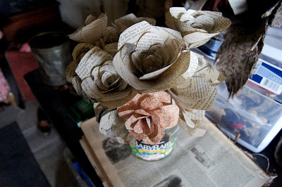 Patterns drawn out for petals and getting ready to cut them out. The paper we are using is from an old bible that is falling apart from the year 1880.